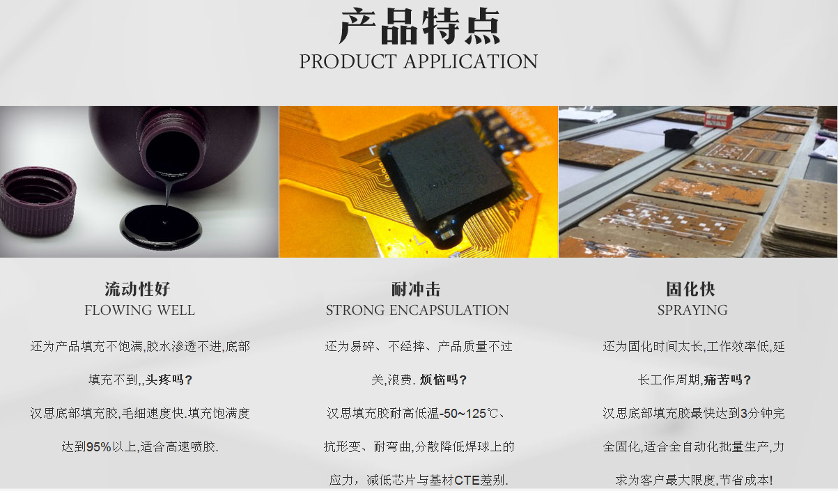 漢思底部填充膠特點有可返修、快速固化、無空洞、快速流動,具有良好的粘接強度和可靠性。通過了雙85測試。